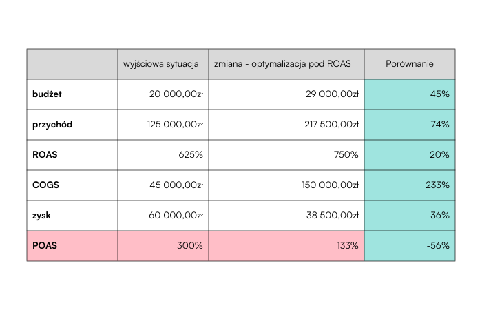 Klient z branży e-commerce inwestował w kampanie Facebook Ads, opierając się na metryce ROAS (Return On Ad Spend). Z kwartału na kwartał ten wskaźnik rósł, natomiast marże malały. Wydawało się, że wszystko jest w porządku, ale rentowność biznesu spadała.