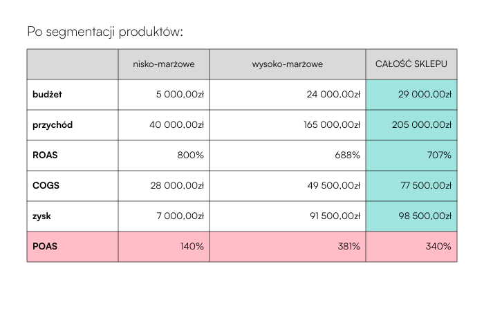Zmodyfikowaliśmy podejście zastępując ROAS wskaźnikiem POAS, który pokazuje faktyczny zysk, a nie tylko przychód oraz uwzględniliśmy LTV (Lifetime Value) i marżę w analizie. W efekcie, przekierowaliśmy budżet na bardziej opłacalne kampanie. Kluczowe było takie posegmentowanie produktów w kampaniach, by większą część budżetu przeznaczyć na kategorie wysoko-marżowe (i jednocześnie dużo droższe), a produkty nisko-marżowe optymalizować według przekazywanych w czasie rzeczywistym danych o rentowności.